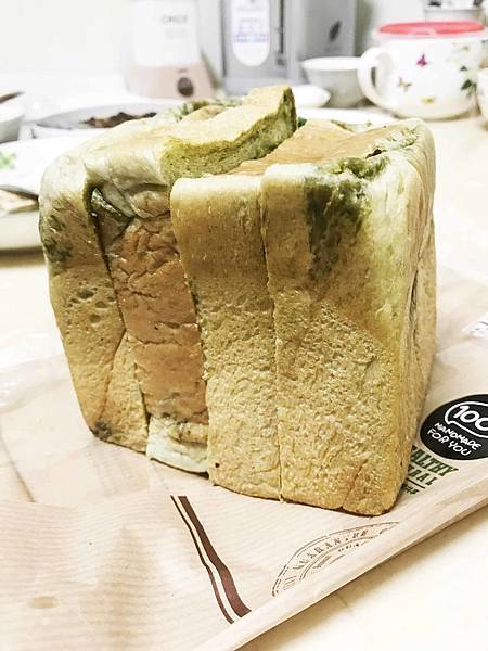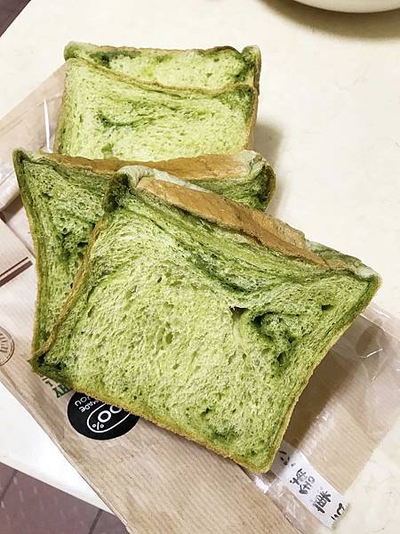 一抬頭就看到抹茶吐司!這款抹茶吐司其實是整個賣,沒切,就像個方磚放在架上,結帳時店員會詢問要不要切,一般是建議切4塊,大概是厚片土司的厚度,口感最好,其實我不想切,我很喜歡不切的土司,要吃時一片片剝下來,看它的〝纖維〞~口感也很好,感覺療癒~但因為有家人要吃,為了方便就還是切了。