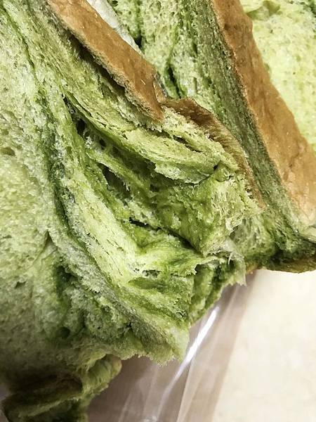 漂亮的綠色實在太吸引我,回到家立刻啃掉一片,細柔、滑順、甜度適中、不太掉屑、沒有乾硬的吐司邊,根本夢幻逸品啊!